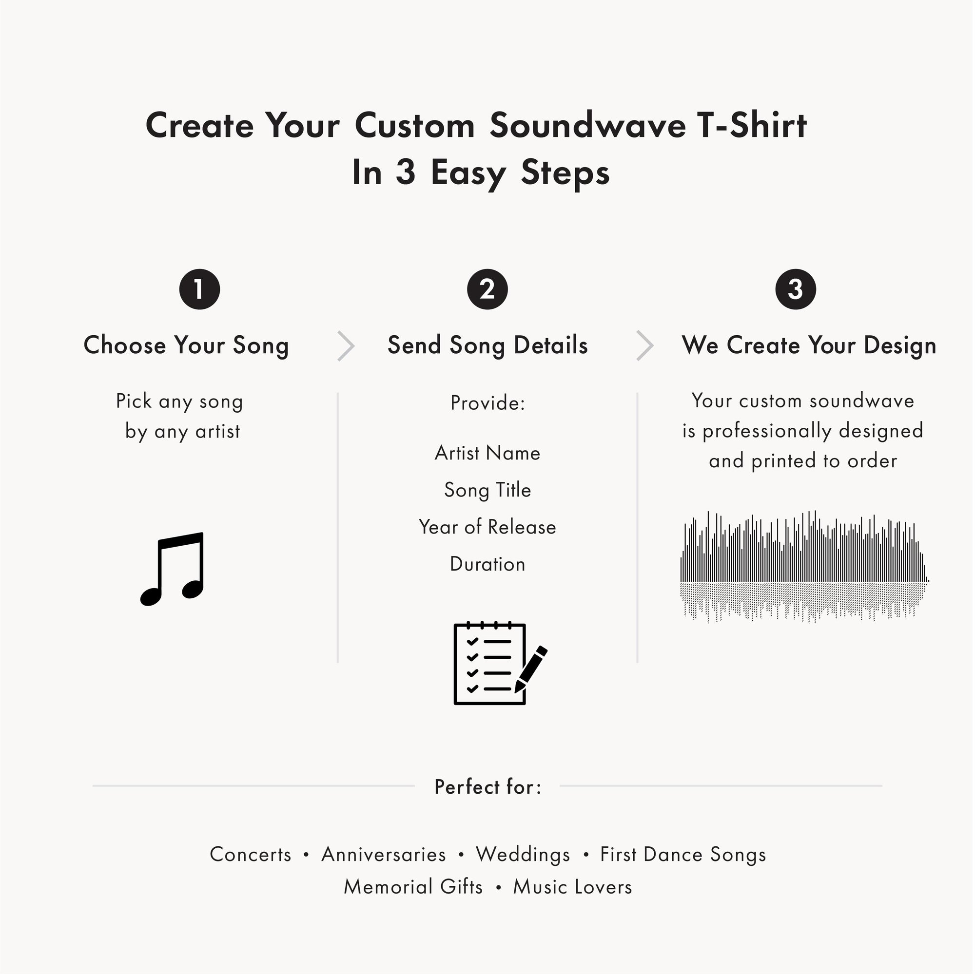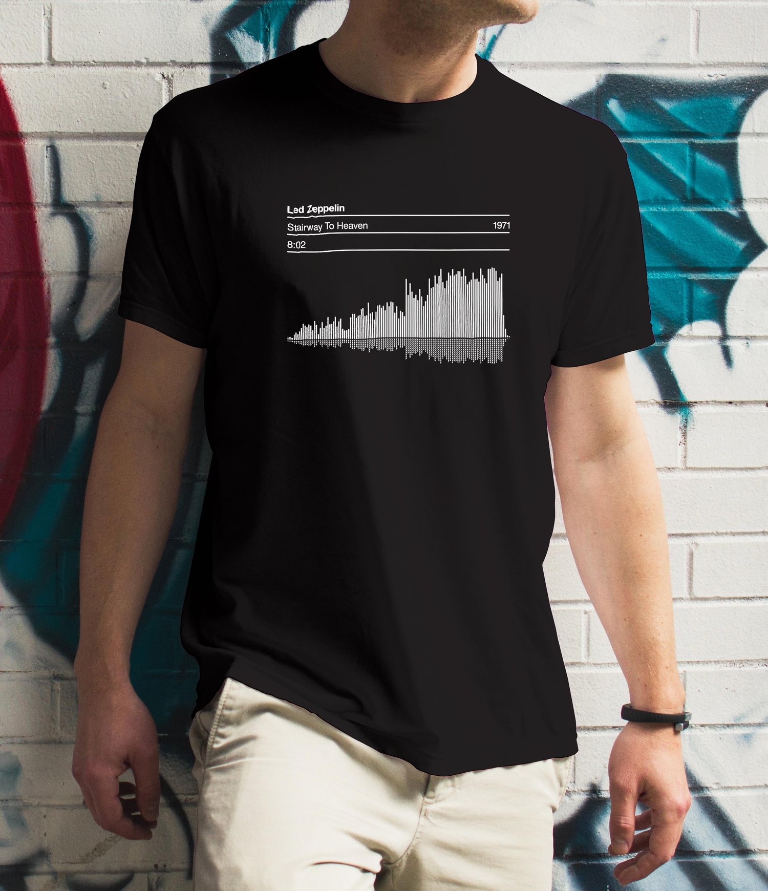 A hand-designed waveform of your chosen song — created as a clean, minimal piece of wearable art.