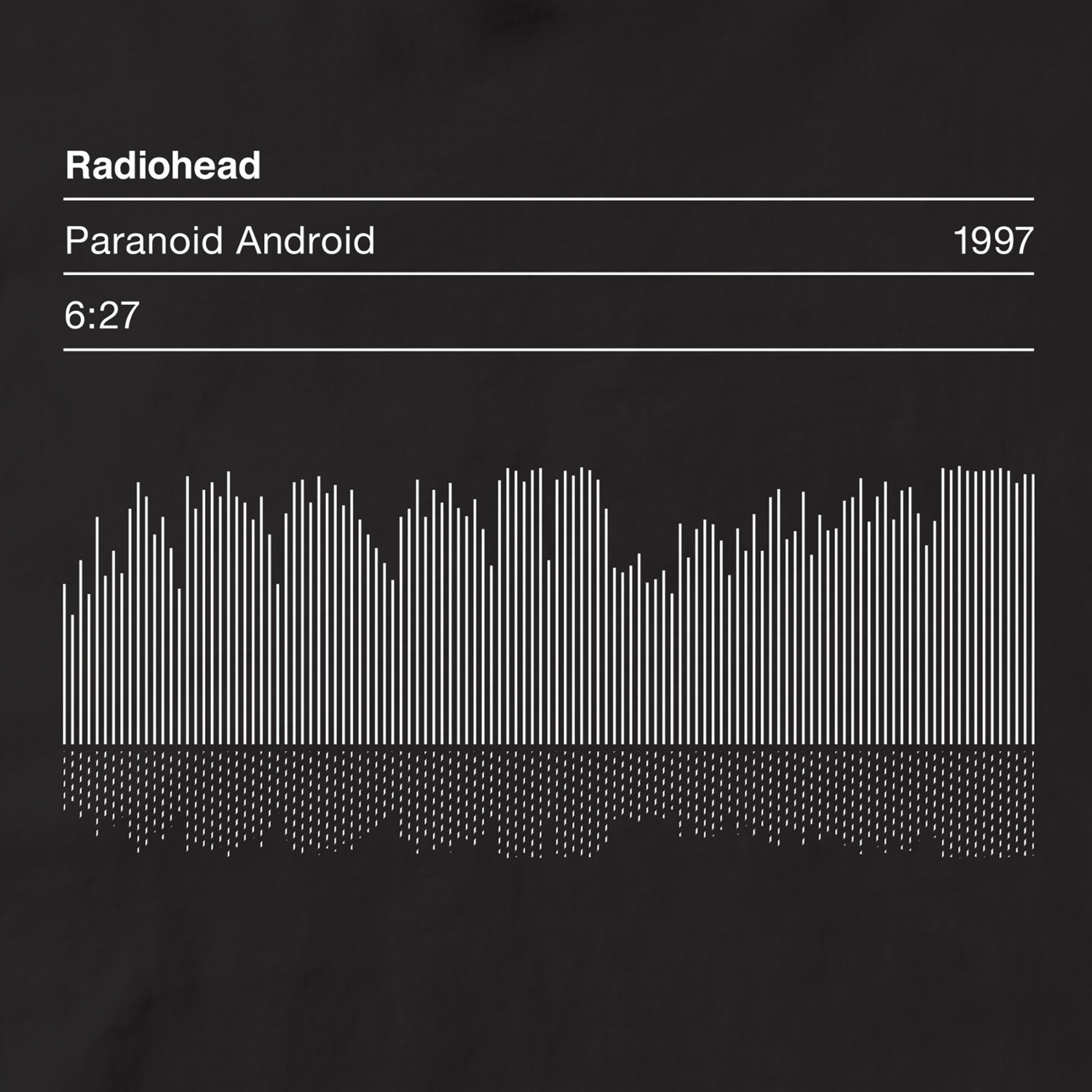This T-shirt displays a graphic sound wave representation of the track “Paranoid Android” along with vital info including song length and date of release. It is printed in-house by Serigrafica7585 on high-quality organic cotton.