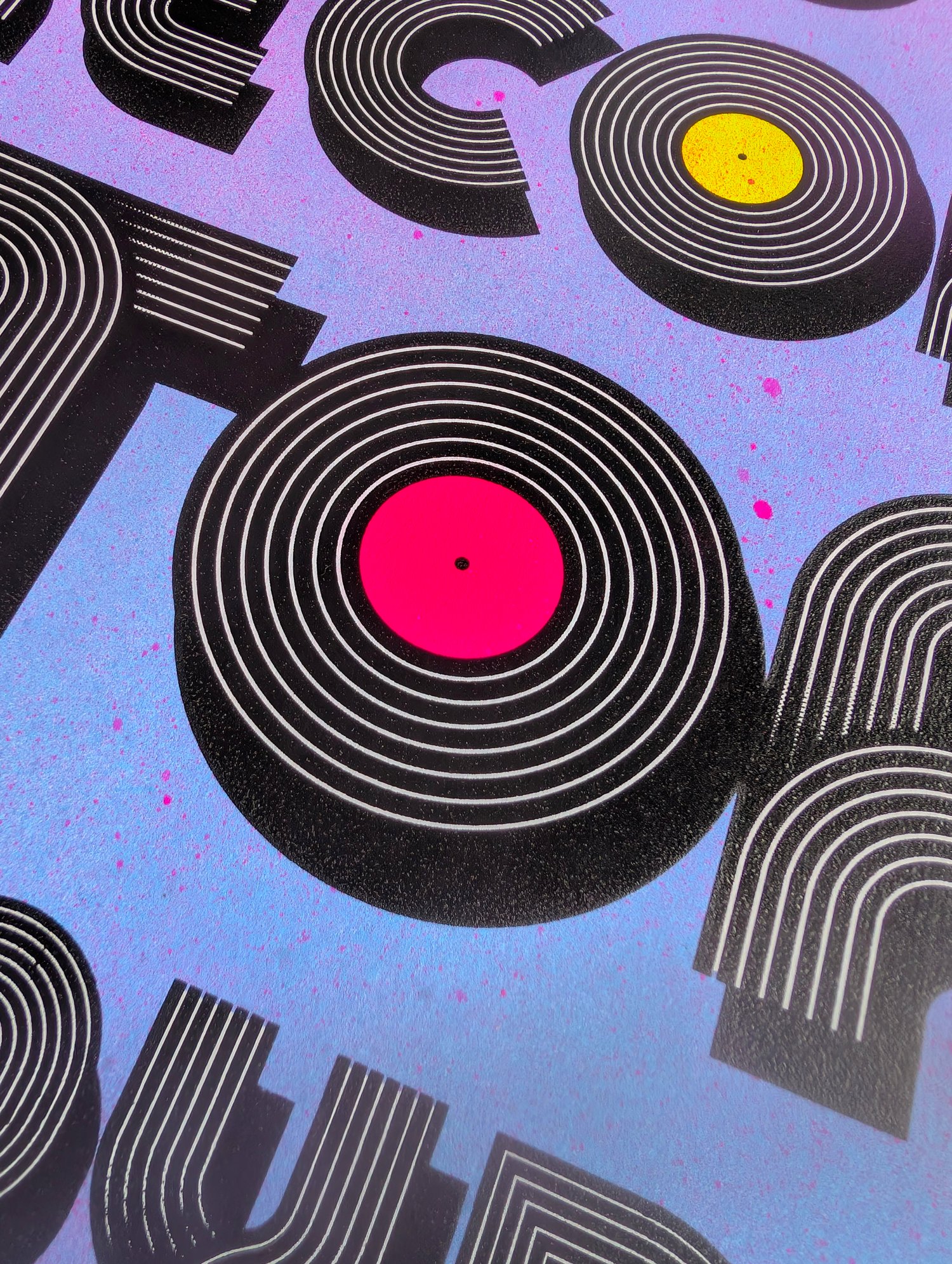You are viewing an original graphic screen print featuring custom typography inspired by the grooves of vinyl records!